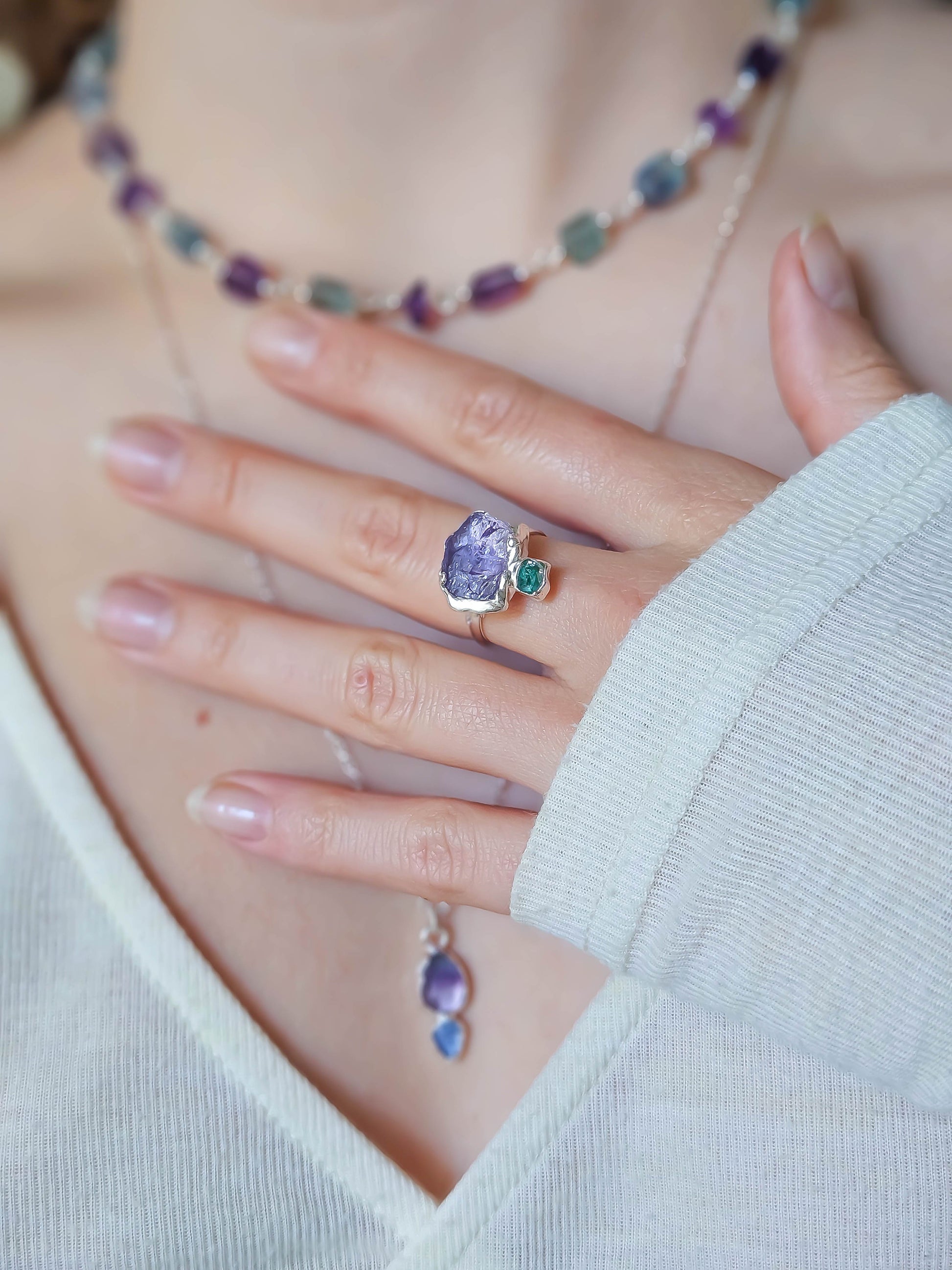 ✨ Cette bague est ornée d’une magnifique améthyste brute, aux textures naturelles et uniques.